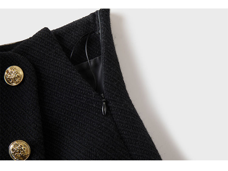 Crafted from soft, durable fabric with a touch of stretch, this elegant skirt is a must-have for any season. The design features a sleek wrap style, accented with sculpted gold buttons for a touch of sophistication.